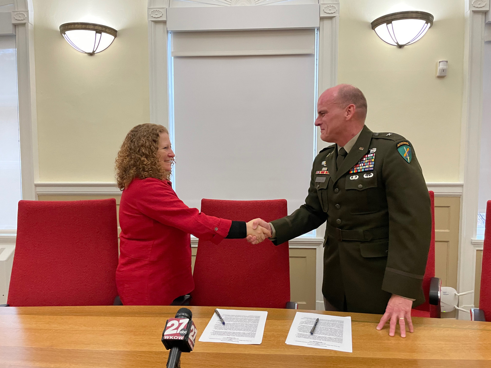 UW–Madison Chancellor Jennifer L. Mnookin and Brig. Gen. Dean Thompson, 353rd Civil Affairs Command, shake hands after signing the MOU between UW–Madison and the U.S. Department of Defense.