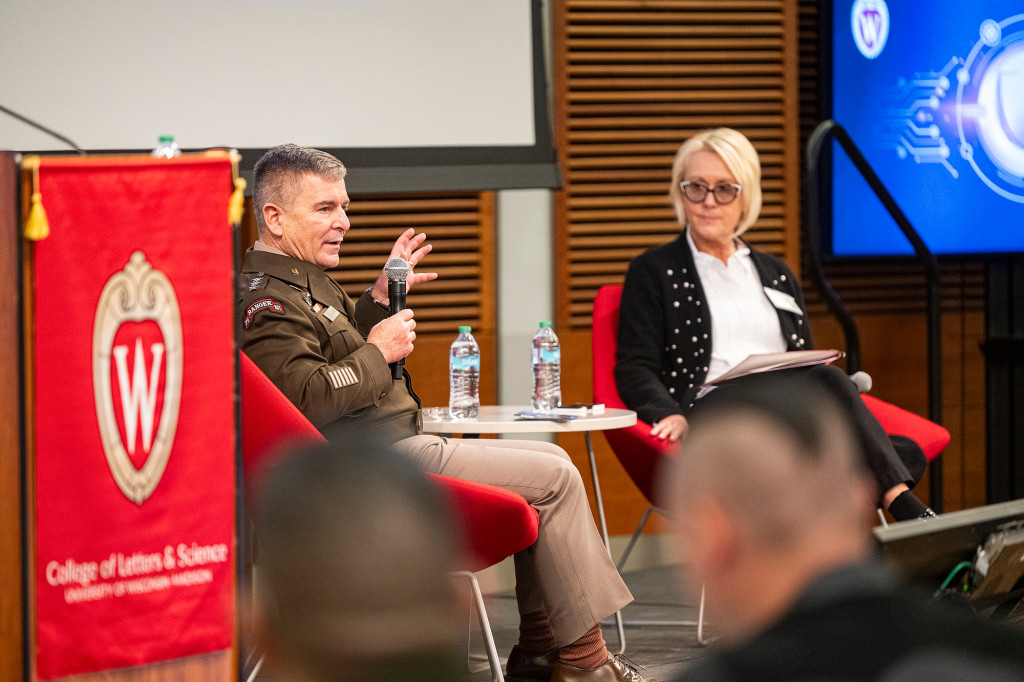 Army Lt. Gen. Joe Hartman, acting head of U.S. Cyber Command and the National Security Agency (NSA), and Dorota Brzezińska, UW–Madison Vice Chancellor for Research, discuss the critical role that academic institutions like UW–Madison play in advancing cyber capabilities, developing new technologies and preparing a capable workforce at the UW–Madison Cyber Research Forum.